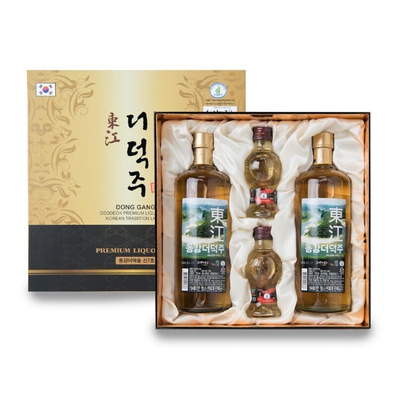 동강 더덕주 선물세트 7호/ 750ml(20%)*2병+100ml(20%)*2병을 선물상자에 함께 담았습니다.